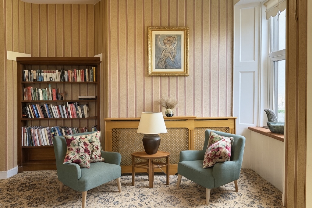 Two side windows overlooking the parking area and the driveway. Inset book case to the back wall. Radiator. Cornice with centre rose and pendant lights. Door to the hall . There is a heavy curtain which can be close for privacy between these two areas