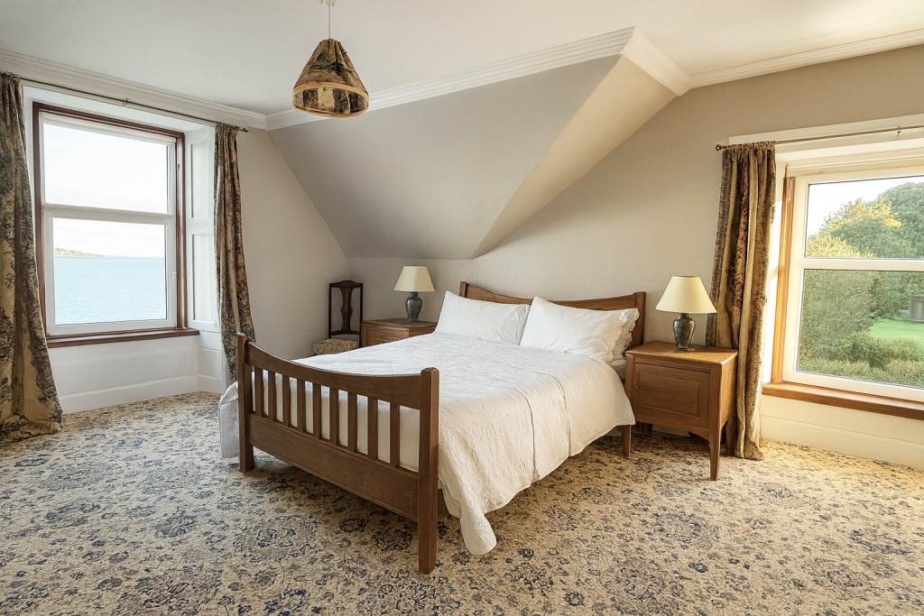 Another good size double bedroom with duel aspect windows to the back and the side of the property windows with amazing views over the gardens and open Clyde estuary.