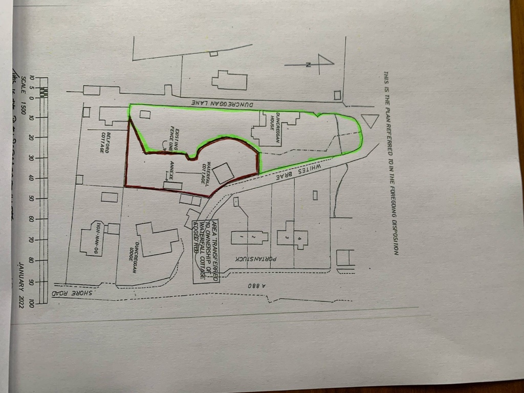 Large lawn formally a tennis court with border flower beds mature shrubs and bushes surround the main garden area. Gravelled driveway with wrought iron gates leading of Whites Brae to Duncreggan Lane and the garage for the property . The driveway has plenty parking and hard standing, Two large Garden sheds , wood storage , Pond with running stream,