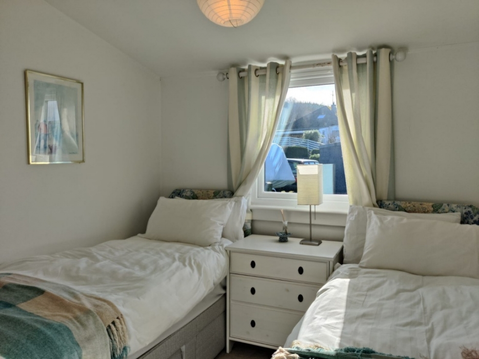 Twin bedroom with window to one side with partial loch view .